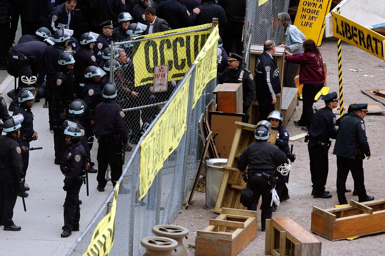 Hundreds of officers with the New York City Police Department descended on the Occupy Wall Street encampment in Lower Manhattan late this evening. At approximately 1.00am protesters say the NYPD set up emergency vehicles around the park and turned on massive flood lights. Scores of officers in riot gear began entering the park and handing out notices of eviction. Protesters say there was little time to respond the department's orders to disperse. Several hundred of the demonstrators rallied around the park's central eating area.