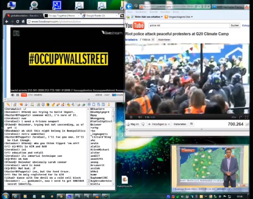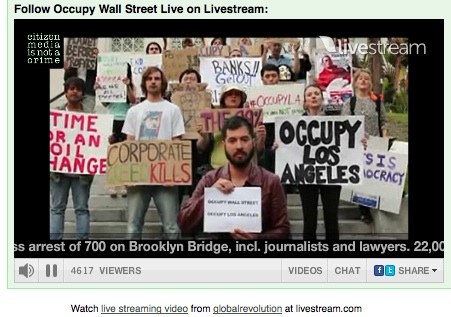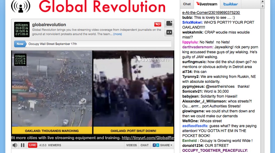 Global Revolution brings you live stream video coverage from independent journalists on the ground at nonviolent protests around the world. The team includes members of Mobile Broadcast News, Glassbead Collective, Twin Cities Indymedia and the alt.media ninjas that brought you Terrorizing Dissent and Democracy 101 documentaries. Currently broadcasting from #OccupyWallStreet protests in NYC that began on Saturday, Sept 17, 2011.