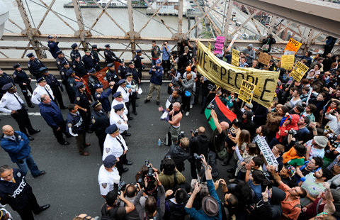 NEW YORK TIMES: Updated, 3:35 a.m. Sunday | In a tense showdown above the East River, the police arrested more than 700 demonstrators from the Occupy Wall Street protests who took to the roadway as they tried to cross the Brooklyn Bridge on Saturday afternoon. (After a 2 week corporate media blackout, #occupywallstreet direct action is now front page news)