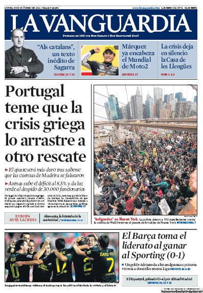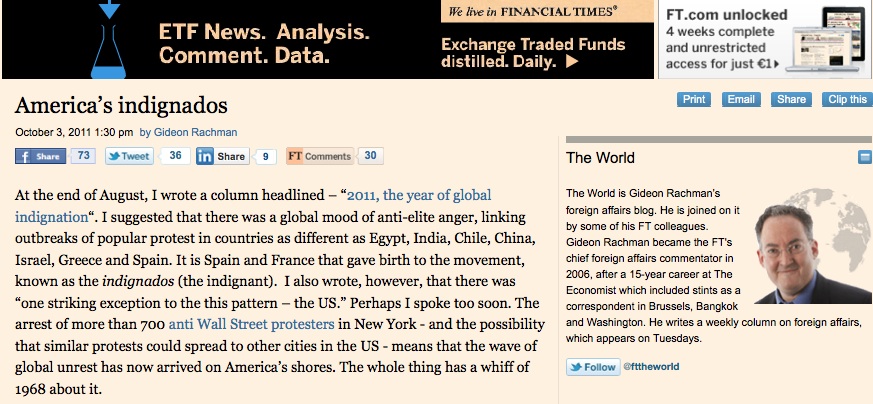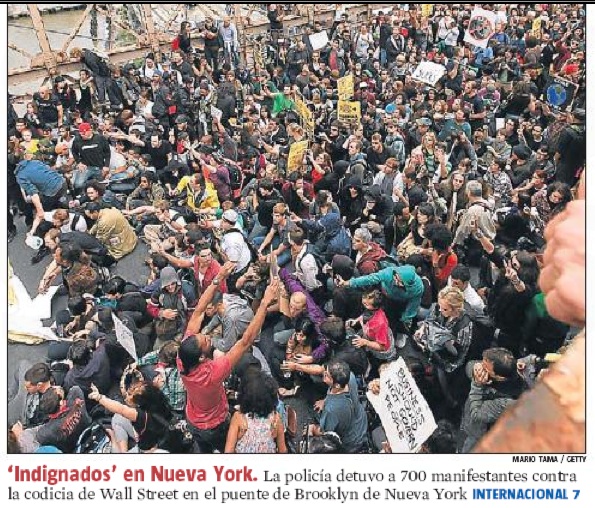 So from the revolts in North Africa, what has been called the "Arab Spring", what jumped across the straights of Gibralter and spread throughout spain; the peaceful revolution dubbed the "15M" (May 15th was the first day of action)... Thankfully and finally Indignation has spread to the US... Good luck to all there, hopefully we will see this massive spark jump to all those places which are still not indignant and on the streets making change... Like Ireland