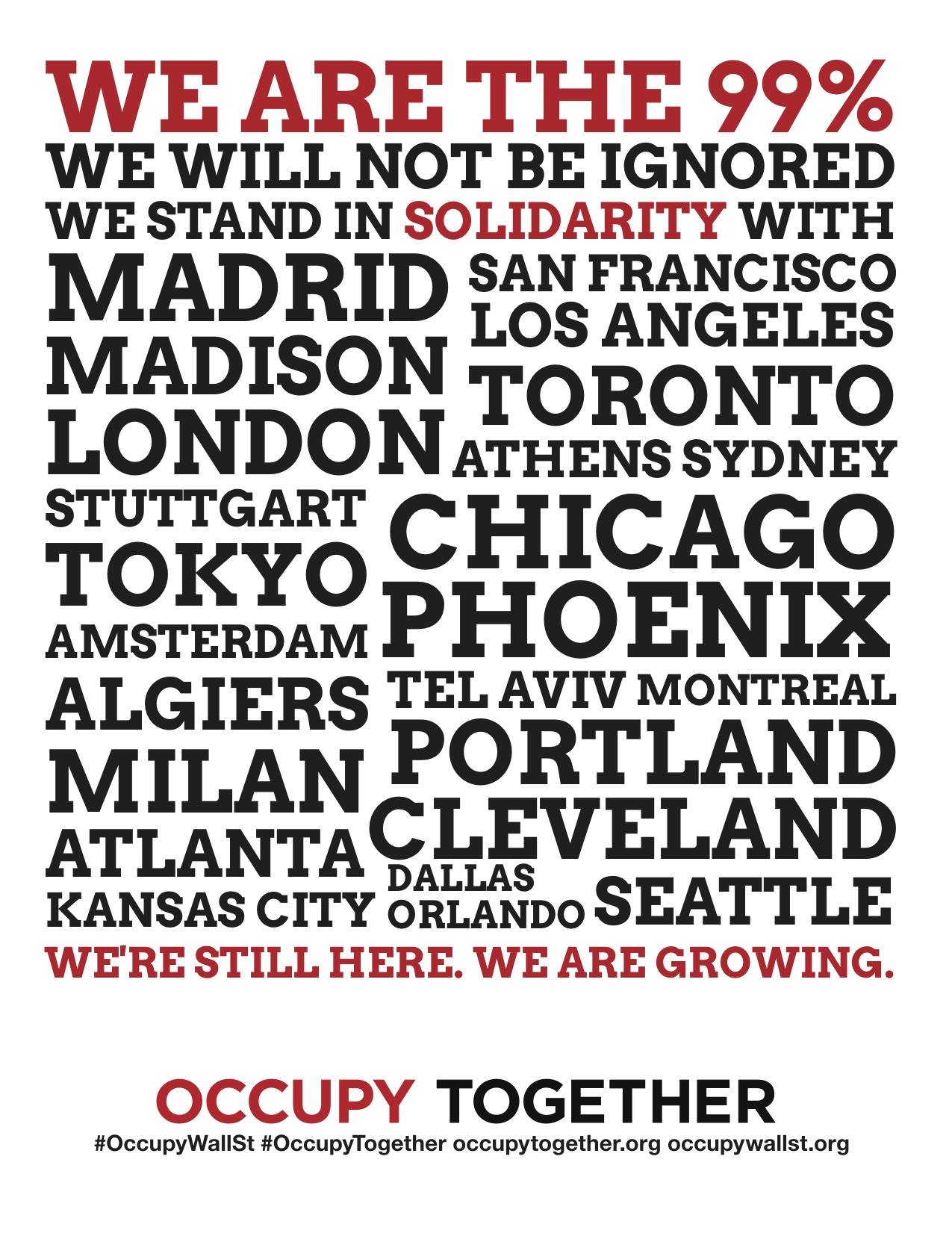 Occupy Together exists solely to help organize, publicize, and support the growing number of communities that are showing support for the Occupy Wall St. movement. We don’t have any other agenda outside of this. We stand by the developing mission of Occupy Wall St., but we are not representatives for Occupy Wall St.