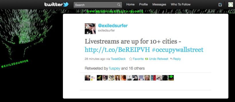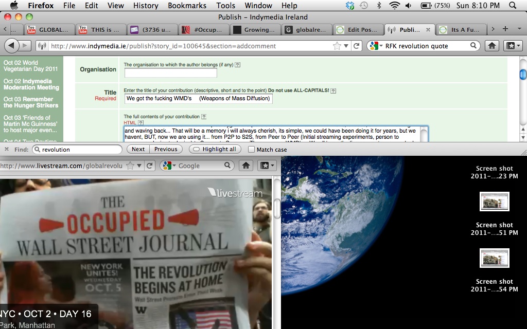 WOW... this is a truly truly important moment we are going through... It really feels like WE ARE WINNING, communication is playing a massive role in this, the spreading of ideas, face to face, in the streets, in the occupied squares, in workshops, on the net, on radio, on live streams, on tweets, on FB pages, emails... Only a few minutes ago I opened a mail from an eco activist list, with a post to a link, which had summary of COOL SHIT, number 2 on that list after the adbusters call to #OCCUPYWALLSTREET was link to GLOBALREVOLUTION.TV, which im watching the live stream from presently. Now an ANONYMOUS masked up activist is talking about the Global Day of revolution which will be happening in 13 days... next saturday; OCTOBER 15, maybe this will be the day they talk about in years to come, that simple, beautiful, peaceful day when it all changed.
