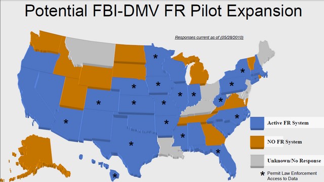 Getting back to the report it goes on to say: According to their 2006 report, the NGI program utilizes “specialized requirements in the Latent Services, Facial Recognition and Multi-modal Biometrics areas” that “will allow the FnewBI to establish a terrorist fingerprint identification system that is compatible with other systems; increase the accessibility and number of the IAFIS terrorist fingerprint records; and provide latent palm print search capabilities.” Is that just all, though? During a 2010 presentation (.pdf) made by the FBI’s Biometric Center of Intelligence, the agency identified why facial recognition technology needs to be embraced. Specifically, the FBI said that the technology could be used for “Identifying subjects in public datasets,” as well as “conducting automated surveillance at lookout locations” and “tracking subject movements,” meaning NGI is more than just a database of mug shots mixed up with fingerprints — the FBI has admitted that this their intent with the technology surpasses just searching for criminals but includes spectacular surveillance capabilities. Together, it’s a system unheard of outside of science fictionSo okay lets read that again: ... Specifically, the FBI said that the technology could be used for “Identifying subjects in public datasets,” as well as “conducting automated surveillance at lookout locations” and “tracking subject movements,” The image below is from a presentation showing how the system can zoom in a pick 3 people from a crowd and then recognise that person again in a later shot. If you are not getting worried at this stage, then you have to be brain dead. To continue with the report it says: New Scientist reports that a 2010 study found technology used by NGI to be accurate in picking out suspects from a pool of 1.6 million mug shots 92 percent of the time. The system was tested on a trial basis in the state of Michigan earlier this year, and has already been cleared for pilot runs in Washington, Florida and North Carolina. Now according to this week’s New Scientist report, the full rollout of the program has begun and the FBI expects its intelligence infrastructure to be in place across the United States by 2014. .... Jim Harper, director of information policy at the Cato Institute, adds to NextGov that investigators pair facial recognition technology with publically available social networks in order to build bigger profiles. Facial recognition "is more accurate with a Google or a Facebook, because they will have anywhere from a half-dozen to a dozen pictures of an individual, whereas I imagine the FBI has one or two mug shots," he says. When these files are then fed to law enforcement agencies on local, federal and international levels, intelligence databases that include everything from close-ups of eyeballs and irises to online interests could be shared among offices.And to prove not all US senators are sold on this sort of thing, the report quotes US Senator Al Franken (D-Minnesota): “Once someone has your faceprint, they can get your name, they can find your social networking account and they can find and track you in the street, in the stores you visit, the government buildings you enter, and the photos your friends post online.”As of this stage the program is 60% deployed and the map below shows states where facial recognition (FR) is already in pilot operation. Some readers might think well this is just a US story so so what? As already indicated in the article it explicitly says this will link other with other similar departments worldwide and with certainty we can include the UK seeing they are most eager with this kind of technology, but it is very likely to be deployed in most other countries and is actually mostly likely already being piloted. The ease at which this can be done is really quite simple, because even in little old Ireland, there are already 1000's of cameras and all that is required is to simply divert or send a copy of these data streams to the appropriate centers and simply load the software. Given the enormous bandwidth of fiber optic cables and their widespread presence, it is irrelevant where the data and analysis center is. For all we know the US or UK could simply for a fee be already or plan to, offer to run the service for the Irish and give them private web (or whatever) access to the results. Of course they get to extend their own networks and scoop up the data here essentially for free. The full text of the report can be read at the link below