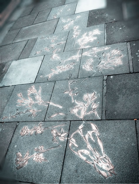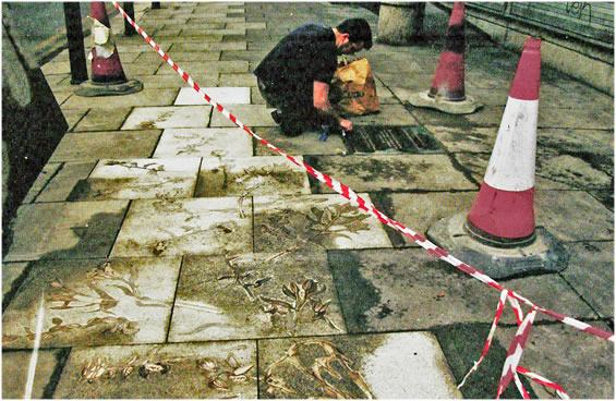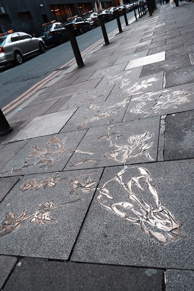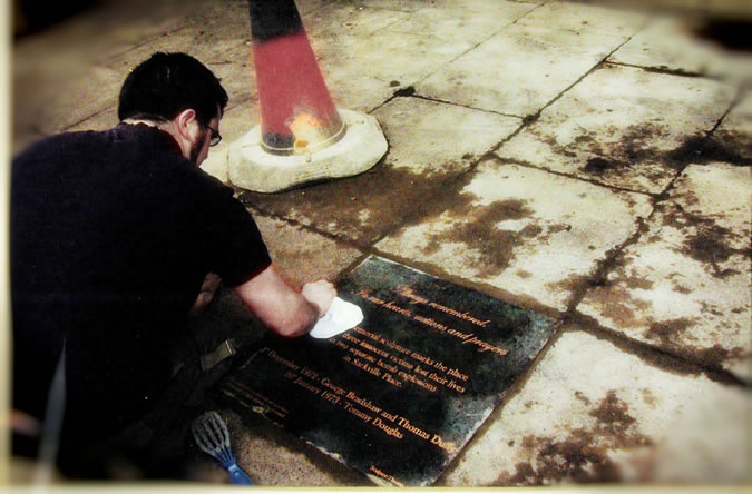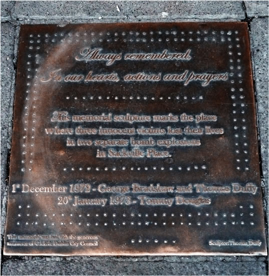 In the summer of 2004, Tom Duffy (the unborn son of Tommy Duffy when he died in 1972) designed a memorial on Sackville Place for the three bus workers who had died in the bombings. It's a bronze sculpture embedded in the pavement of an upturned vase and the flowers falling out of it. it's called 'A Fallen Bouquet'.