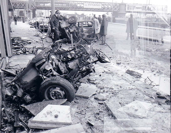 Here are a couple of pictures of the scene following the first car bomb on the night of the 1st of December 1972. There were believed to be around 100lbs of explosives in the car.