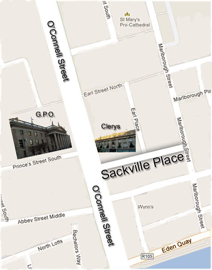Map of O'Connell Street area showing the location of Sackville Place in relation to the GPO and Clerys