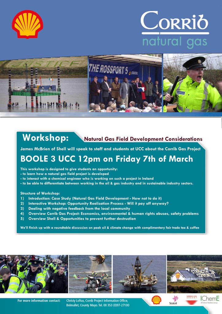 ![]() - College security and Gardaí mobilise to prevent debate - On midday on Friday 7th March the Institute of Chemical Engineers - and their corporate sponsors, Shell - had organised for an engineer from Shell's Corrib Gas Project to give a talk and workshop for staff and students of the Engineering College at UCC. A cork group formed and mobilsed to attend the lecture, distribute independent information on Corrib and challenge any Shell spin. The event was advertised very low key, but some UCC students brought it to the attention of some of the wider community of Corkonians involved in solidarity work against Shell & the Corrib Gas Project a few days before the lecture was due to take place. by Justin Morahan Wed Mar 19, 2014 15:10 ![]() It's great to see that solidarity is alive and well. Kudos to you and your friends. But what does it say of the sorry state of this country when our Gardaí have to patrol a University lecture and possible dissenters are kept at bay. by Doolin - Environment & Oil Industry Sat Mar 29, 2014 16:22 ![]() The Corrib remains a live issue and it is good to see students keeping the academics informed from grassroots activity. |