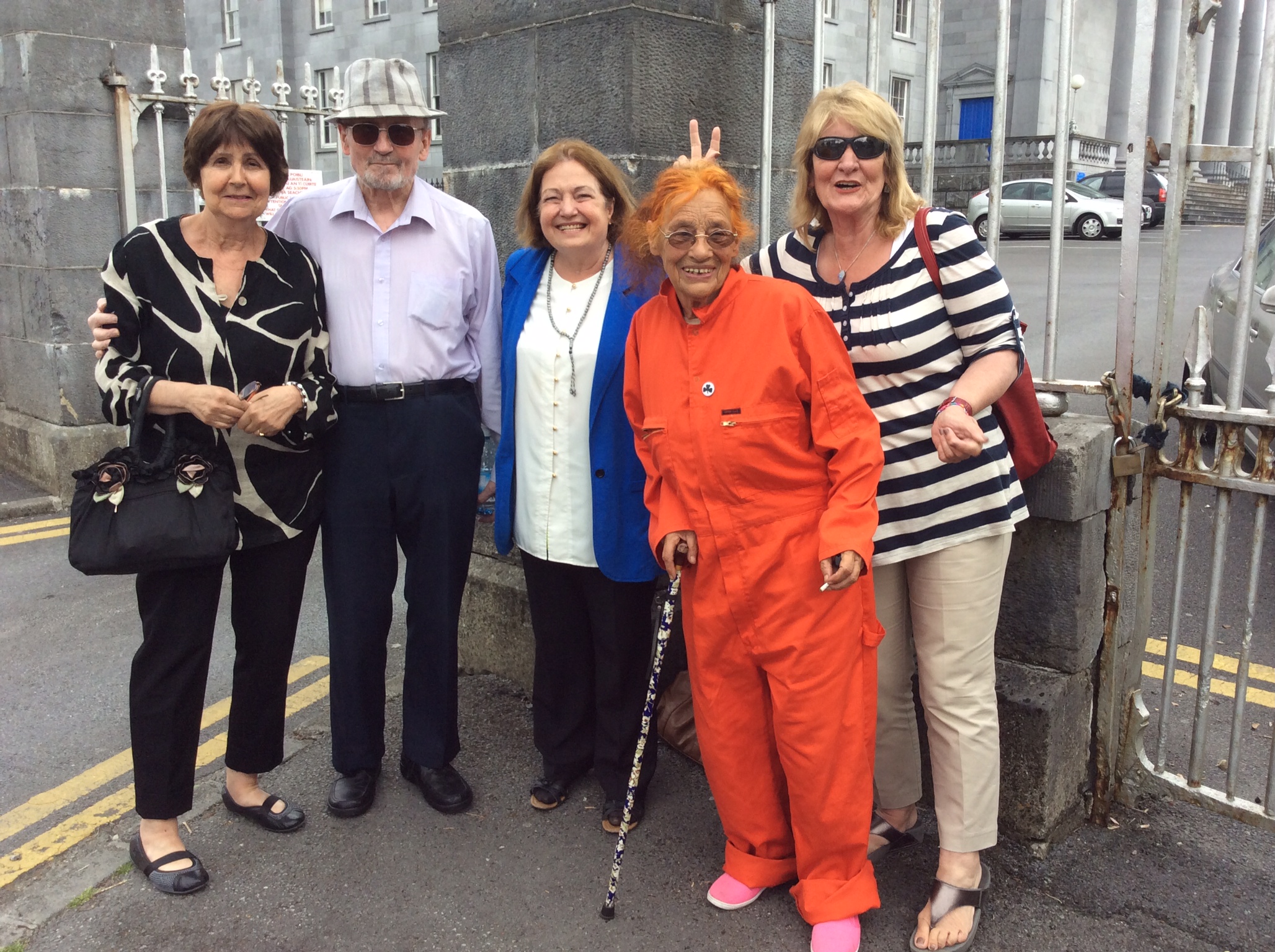 Margaretta D'Arcy set the court on fire in Ennis yesterday in the defence of her action of sitting on the runway at Shannon airport with Niall Farrell to protest against US war planes using the Irish airport as a warport for transporting US troops and weapons to war in Afghanistan, Syria or elsewhere. Her witnesses Clare Daly, Tom Clonan, Mairead Maguire, Ed Horgan and John Lannon lit similar fires in her defence. The courtroom was alight with passion and truth. It was an historic day on which Margaretta and her witnesses filled an Irish courtroom with palpable joy. The day belonged to Margaretta and Niall. Their action in non-violently opposing Irish participation in war was vindicated. The court, the State, the prosecuting Gardaí were the big losers. The legal jargon of the court was drowned in the passionate voices of Margaretta and her witnesses.