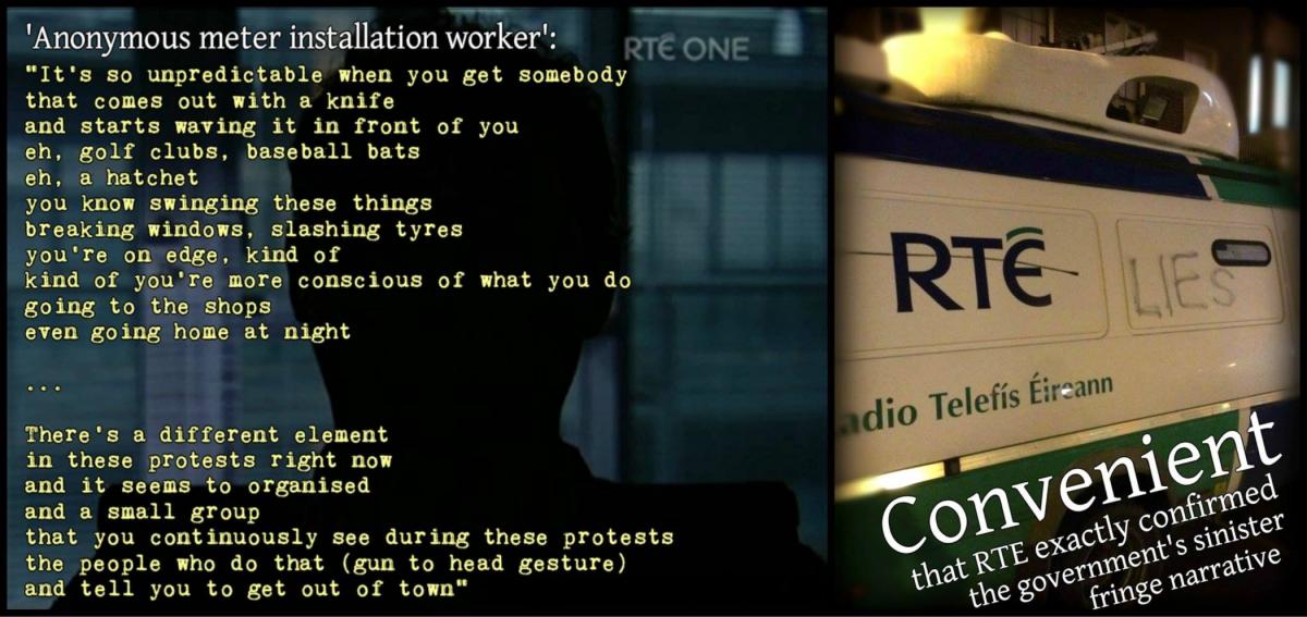 On Thursday night RTE Primetime presented what many have described as a 'regime broadcast', an utterly transparent hatchet job of the anti-Water Charges campaign. This featured, supposedly, an anonymous water meter installer describing being accosted by knife, hatchet, baseball bat, and golf club wielding maniacal protesters – the sinister fringe. The core message transmitted in the program was 'you can protest, but don't protest effectively'. If you watched it (link below), what did you think?