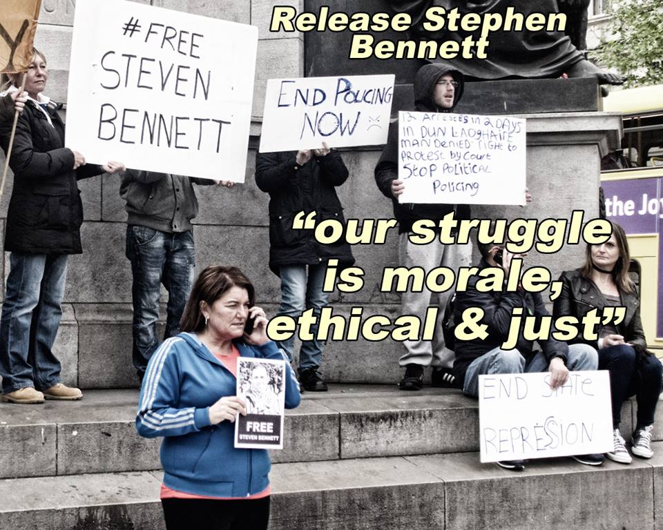 The Water charges protester Stephen Bennett will be in jail for one month tomorrow. He was not convicted of anything, instead the courts attempted to impose 'protest ban' bail conditions which he has continued to refuse to accept. All sections of the water charges movements should be demanding Stephens immediate and unconditional release.