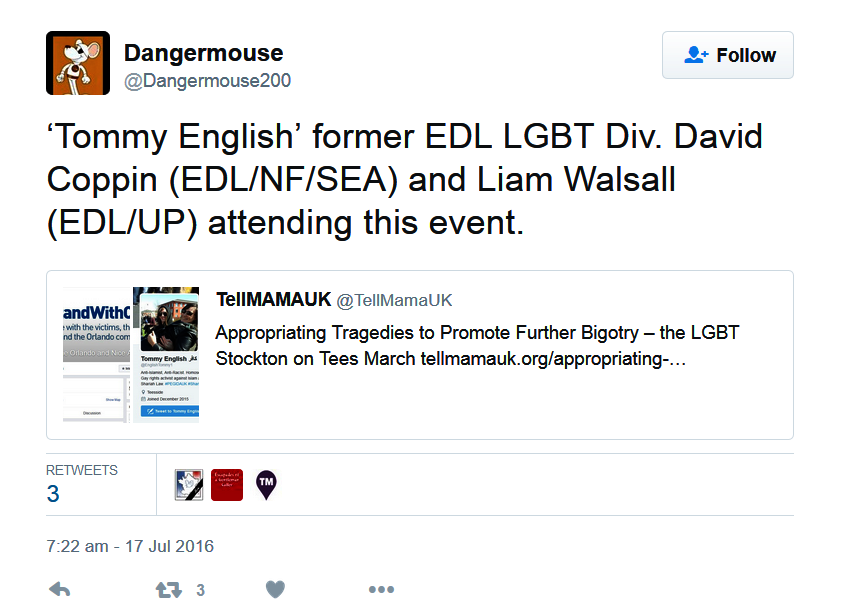 This coming Saturday in Stockton, key members of the EDL and Pegida are organising a fake LGBT march which is advertised as a commemoration of the victims of the Orlando massacre, but is in-fact an incredibly divisive, racist anti-Muslim march aimed at turning Gay, Lesbian, Bi and Trans people against Muslims. Speakers include senior UKIP member and Sharia Watch organiser Anne-Marie Waters of Pegida, Northeast EDL thug Bill Weir, and Tommy Cook (AKA Tommy English) who was the EDL's token LGBT Division leader, and is now with rival anti-Muslim far right organisation Pegida UK. Waters, English and Weir are deliberately encouraging racial and religious hatred, and their unwelcome presence in Stockton must be opposed by genuine members of the LGBT communities.