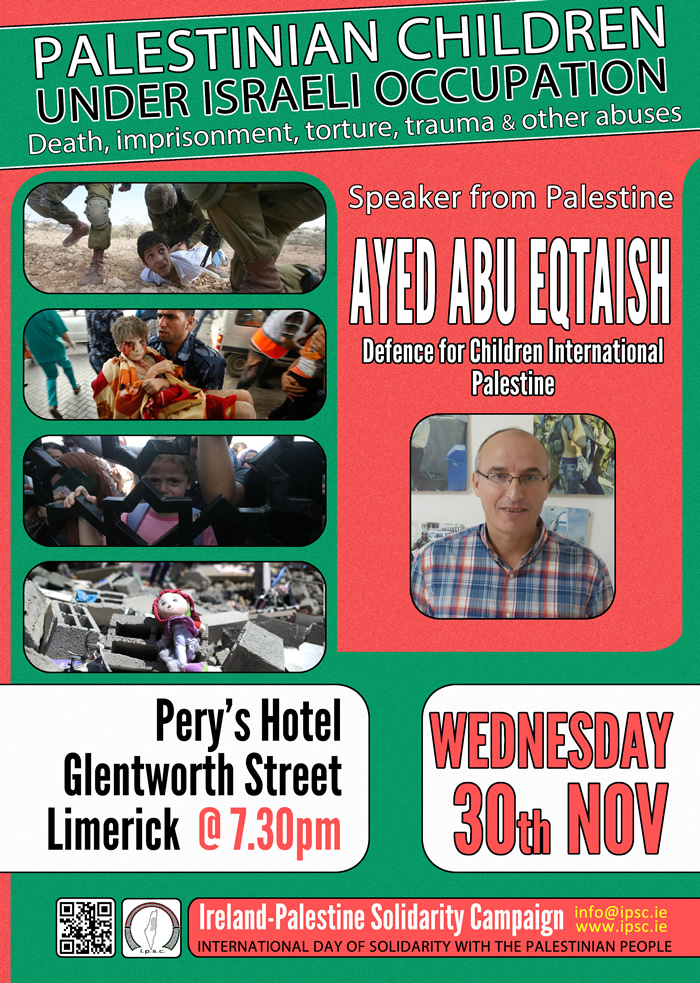 To commemorate the annual International Day of Solidarity With the Palestinian People 2016, the Ireland-Palestine Solidarity Campaign (IPSC) is honoured to host Ayed Abu Eqtaish from Defence For Children International in Palestine. Mr. Abu Eqtaish will speak on Wednesay 30th November in Pery’s Hotel, Glentworth Street, Limerick at 7.30pm.