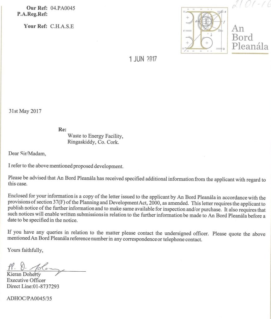 Bord Pleanala has advised that the additional information supplied by Indaver is considered to contain significant additional data in relation to the effects on the environment of the proposed Ringaskiddy incinerator and have invited submissions from observers during a six week period to close 21 July 2017 at 5.30pm.