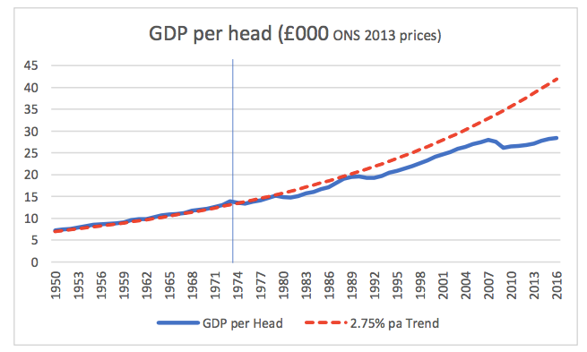 So, given the paucity of evidence for Brexit precipitating an economic collapse, what was behind the blind certainty of the commentariat? One important piece of ideology undergirding the whole Brexit debate is the notion that Britain enjoyed huge economic benefits from joining the EU (or EEC as it was known in 1973). Does that claim hold up to evidence? As a recent study by the Centre for Business Research (CBR) at Cambridge University shows (see graph below), ?there was no improvement in UK growth in per capita after 1973 when compared with previous decades. Indeed, GDP per head clearly grew more slowly after accession than it had in the pre-accession decade.?