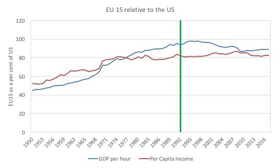 The data clearly shows that not only has the Single Market (starting at the green line) failed to improve the EU15 economies relative to the US, but would actually appear to have worsened it.