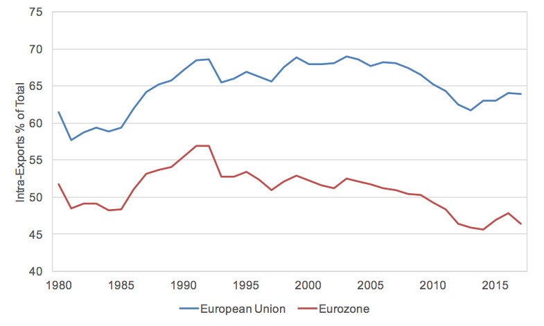 Even more interestingly, the creation of the Single Market has not even boosted trade within the EU. The following graph shows the percentage of exports between EU and EMU [European Monetary Union, developing into the eurozone] countries as a percentage of total EU and EMU exports. After experiencing a steady rise throughout the 1980s, this proportion effectively stagnated between the Single Market?s creation in the mid-1990s and the mid-2000s, and has been on a downward trend ever since (with a slight recovery post-2014). A Bruegel note adds that ?the Euro Area has been following nearly the exact same pattern as the European Union as a whole, suggesting the common currency might not have had the expected effect on trade between Euro Area members.?