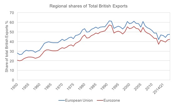 The same applies to the share of UK exports to the EU and EMU, which has stagnated since the creation of the Single Market and has been in decline since the early 2000s (returning to the level of the mid-1970s), with non-EU export markets growing much faster than those within the EU and the eurozone.