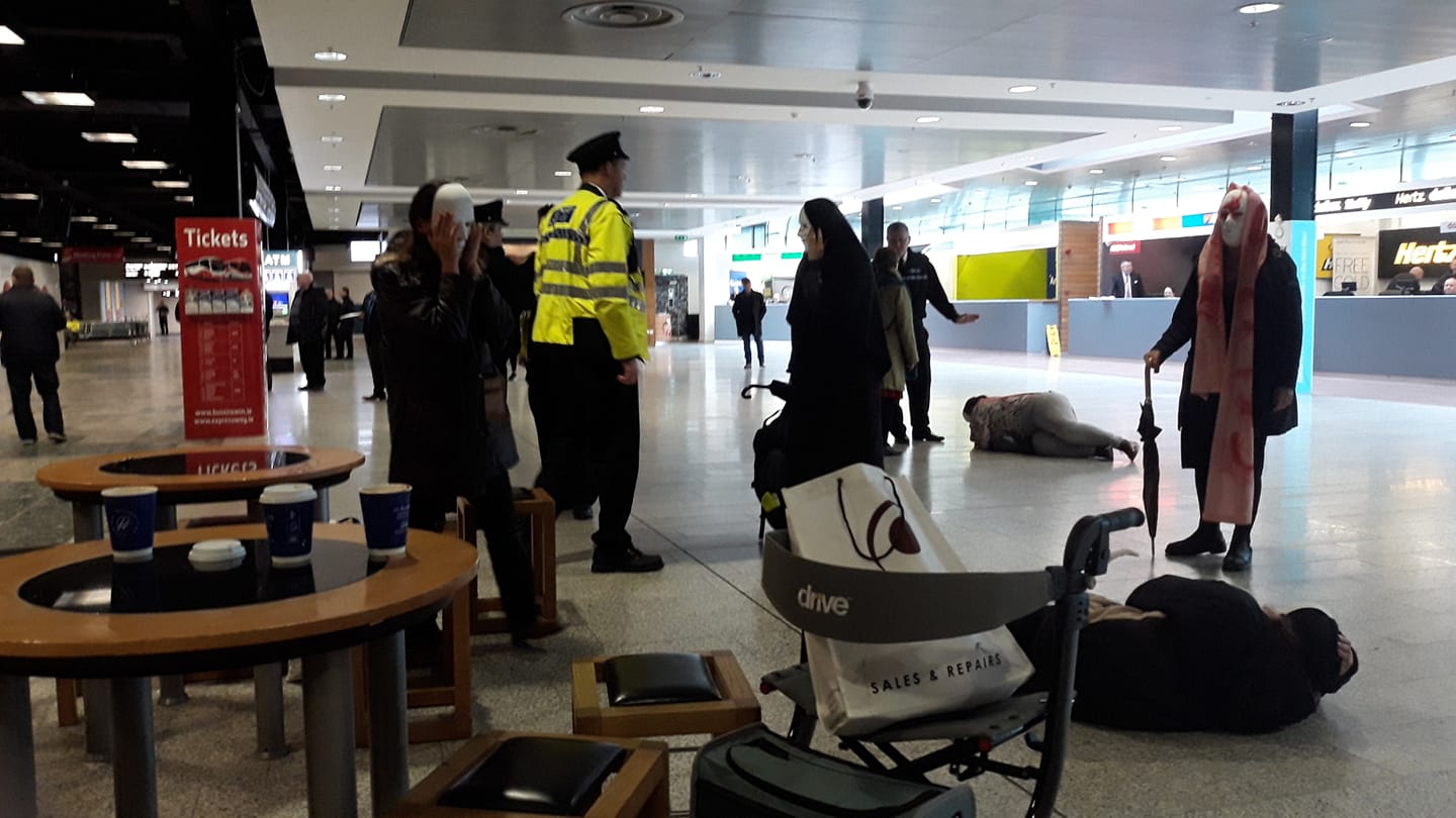 One group of women assembled at the roundabout on the road into the airport while Margaretta led another group within the airport terminal building. Inside the terminal they lay on the floor wearing white death masks and commenced wailing in memory of the hundreds of thousands of innocent women and children who have died as a result of US led resource wars in the Middle East.