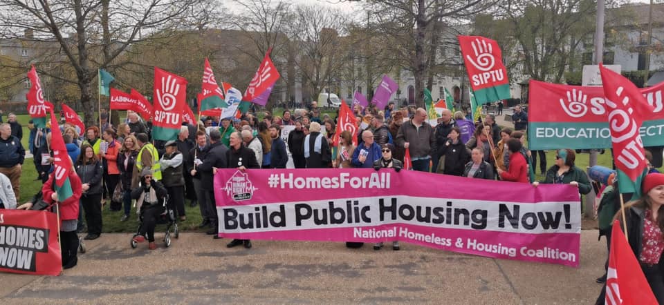 RTE have given coverage to a housing demonstration in Galway this evening that aimed to highlight a common problem around the country which is the shortage of housing. The protest is demanding that the government start building public housing instead of relying on the private sector which are preying on people.