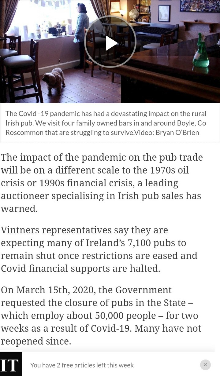 by . Mon Mar 15, 2021 14:18 ![]() https://www.irishtimes.com/news/social-affairs/many-pubs-will-never-reopen-after-curbs-lifted-auctioneer-says-1.4510070?mode=amp |