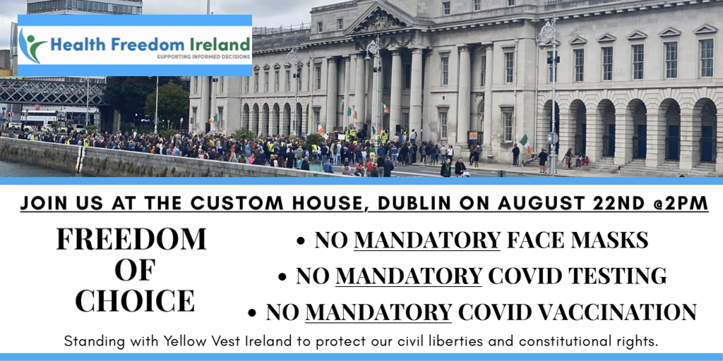 ![]() Save The Date : August 22nd 2020 We need to step out in large numbers to make our voices heard. Let’s aspire to what we saw in Berlin yesterday and stand united on August 22nd. We’ll assemble at the Custom House, Dublin at 2pm. Stay tuned for further details. A protest will be held by Health Freedom Ireland (HFI) and Yellow Vest Ireland protesting against government mandates, demanding transparency, proportionality of decisions and accountability by government officials and advisors on August 22nd 2020 at 2pm in front of the Custom House, Dublin 1. This will be a peaceful protest with speeches and a march. Purple T-shirts will be worn by supporters of Health Freedom Ireland. HFI has no political affiliations. As of 19 March 2020, COVID-19 is no longer considered to be a high consequence infectious disease (HCID) in the UK1 amongst other factors due to the low mortality rate2, yet despite this comparatively low risk and despite Ireland having some of the lowest rates of infection3 in Western Europe, new legislation mandating mask wearing has been ushered in, some five months since lockdown began. Experts across the world are challenging the supposed threat level of COVID-19, and demanding justification for the restrictions we are seeing in Ireland and elsewhere4. Individuals are threatened with €2500 fine or six months imprisonment for refusing to wear a mask in areas such as supermarkets, libraries and shopping centres despite divided expert opinion over the safety and effectiveness of their use by the general public5 . Indeed, the WHO and the CDC until very recently recommended that masks should not be used by the general population, but rather, only by those who are sick. What has changed? Restrictions have been endured since the initial lockdown period when movements were restricted to within a 2km radius of the home. Now we have mandatory masks, hand sanitiser, social distancing, restriction of numbers at funerals and weddings, testing, and travel restrictions, and so on. Ireland is facing a Mental Health tsunami of depression, suicide, self-harm, domestic violence and homelessness. For people these restrictions have meant isolation, disconnection, loss of autonomy, job loss, financial hardship, hopelessness6 at the prospect of another long term economic crisis and the never ending restrictions. Who will be held accountable for the deaths of despair resulting from these draconian measures? What is the death toll of those who did not get that cancer diagnosis until it was too late, because hospital schedules were cleared for a potential inundation of COVID19 patients that never materialised? The people's freedom to choose, and the right to bodily integrity, is rapidly being diminished under the guise of a 'public health crisis'. The mandates for masks set a dangerous precedent for future impingements upon freedoms. We challenge the proportionality of the government’s measures to date: