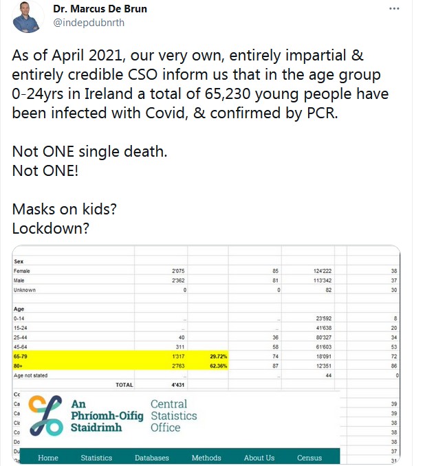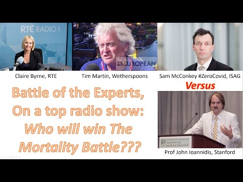 The real tragedy is that government everywhere have been using a relentless campaign of fear and propaganda through lies and manipulation of statistics that has been so successful that unfortunately significant fractions of the population think the risk of series ill-health or even death is tens of thousands of time higher than it really is and at the same time making out that the Covid experiment vaccines are far safer than the are when in reality they are not properly tested. dangerous and nobody knows whether people are taking onboard ticking biological timebombs that could cause devastation in the form of a multitude of auto-immune reactions in people. A good example of the manipulation and the real risks -and that is just based on the utterly unreliable PCR test which means the true risks of Covid are even lower, can be found in this presentation by Ivor Cummins. See: video at https://odysee.com/@IvorCummins:f/ultimate-explanation-of-ireland:0 Caption: Battle of the Experts - on Primetime Radio Show - Mortality Reality Revealed! |