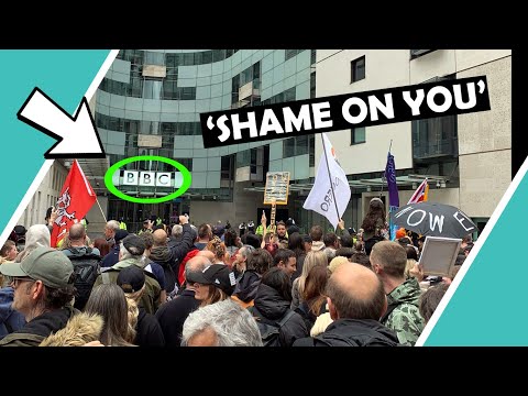 Caption: Thousands Outside BBC Shout SHAME ON YOU