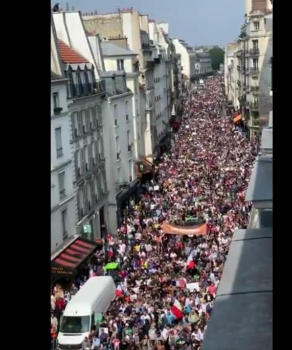 Only the “emergency” of the Covid crisis pushed it, more or less, off the streets. The spirit of revolt has not been very much in evidence in France since March 2020, with the population divided and fearful, as elsewhere. But now, with the announcement that vaccine passports will be required for cafés, restaurants, leisure centres, shopping malls and trains, something seems to have snapped. The arguments about viruses and masks and lockdowns now seem less relevant in the face of this chilling assault on the most fundamental of human rights. Even the jab itself is not really the issue any more, with those who have already had it joining in the protests against the totalitarian laws due to come into place on August 1. I was impressed by the turn-out for the emergency protest in Montpellier on Wednesday July 14, but Saturday’s numbers were on a completely different scale. Even the authorities at the Préfecture admitted that there were 5,000 on the streets on a hot Mediterranean afternoon. The crowd represented a very wide cross-section of the local population. The Gilets Jaunes had already started this process of breaking down the old “left” and “right” political divisions in favour of a broad popular struggle against the power elite. But the process has now clearly gone a step further, with a new mood of defiant unity that must be striking fear into the hearts of Macron and his cronies, not to speak of Klaus Schwab and the global string-pullers. The sense of possibility has been increased by the news that the French Minister of Justice Eric Dupond-Moretti is under criminal investigation for allleged “conflicts of interest”. “We don’t want the pass sanitaire!” chanted the thousands in Montpellier. “Macron resign!” “Résistance!” “Liberté!” It was the same picture everywhere, with massive numbers not just in Paris, but all across France, as this compilation sets out. The people took to the streets in Aix-en-Provence, Quimper, Annecy, Lyons, Perpignan, Nice, Metz, Lille, Dijon, Caen, Toulouse, Reims, Saint-Brieuc, Pau, Strasbourg, Rouen, La Rochelle, Brest, Mulhouse, Bayonne, Narbonne, Saint-Étienne, Albi, Nîmes and La Réunion. They protested in Toulon, Marseilles, Bordeaux, Nantes and Rennes. Tear gas was used on protesters at Besançon and demonstrators blocked a main road at Chambéry. The politics of division seem to be failing as the French people come together to defend the principles of liberté, égalité and fraternité on which their republic is supposed to be founded. I bumped into a couple of anarchist friends on the protest and also took a leaflet from a group called Arme Révolutionnaire Marxiste. This condemns the “Apartheid sanitaire” being imposed by the state: “Treated like fearful cattle, ever more controlled, divided and stripped of our freedoms, we are condemned by power to still further exploitation. “But this time the government’s medicine is not going down, there are more and more of us all the time who understand the reality of this medical mascarade, just as we understand better and better the scam of elections”. Insisted Gilet Jaune Michelle: “This vaccine passport just can’t happen. We can’t give up”. |