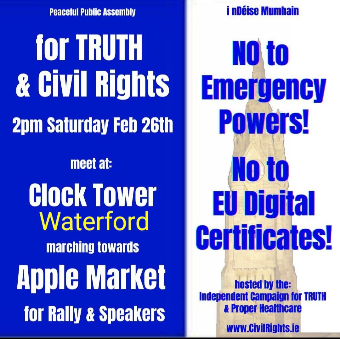 Join the March & Rally / Discussion in Waterford on this Saturday the 26th February, gathering at the Clock Tower for 2pm.