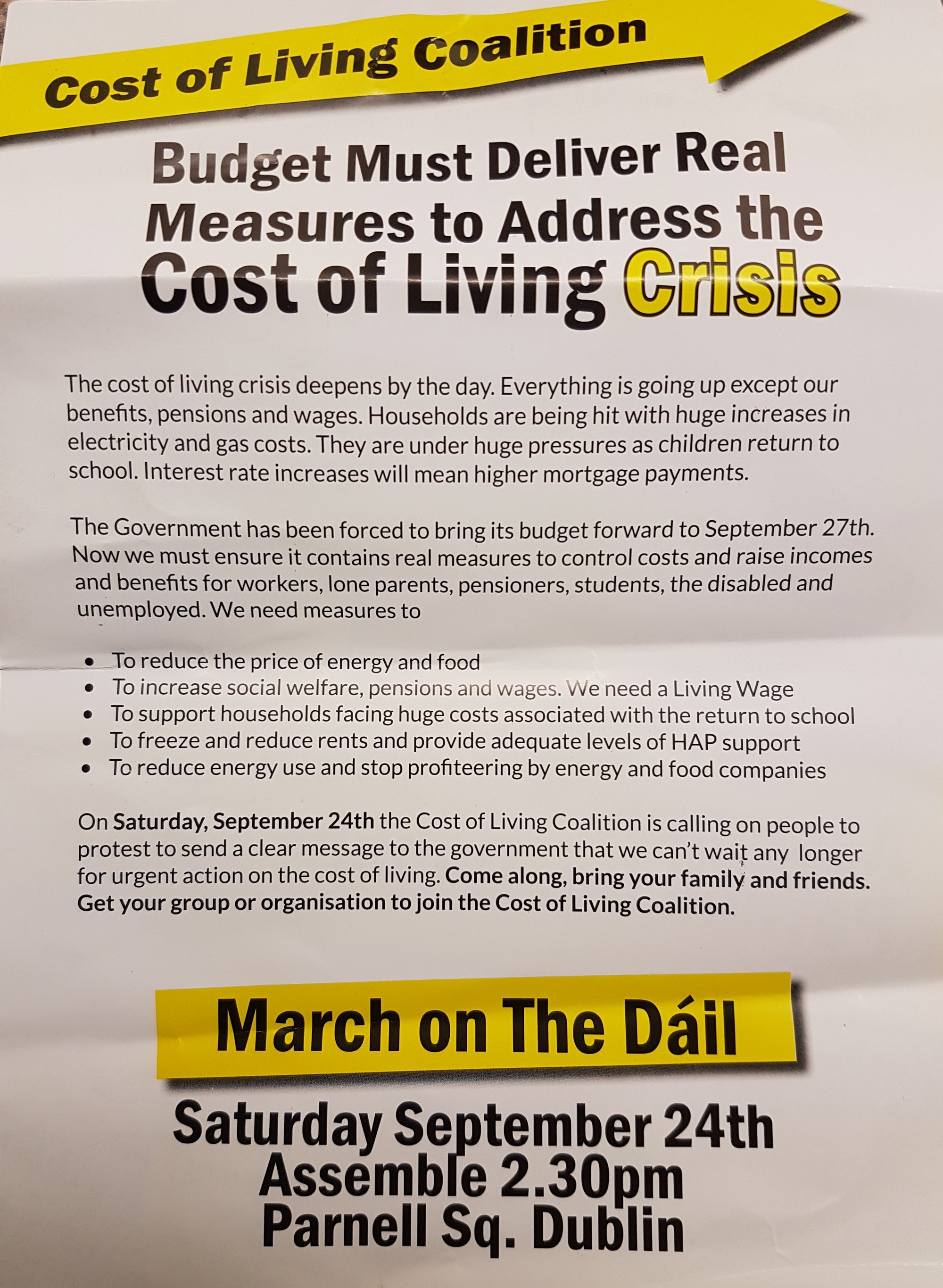 Cost of Living Crisis- March to The Dail - Sat Sept 24th