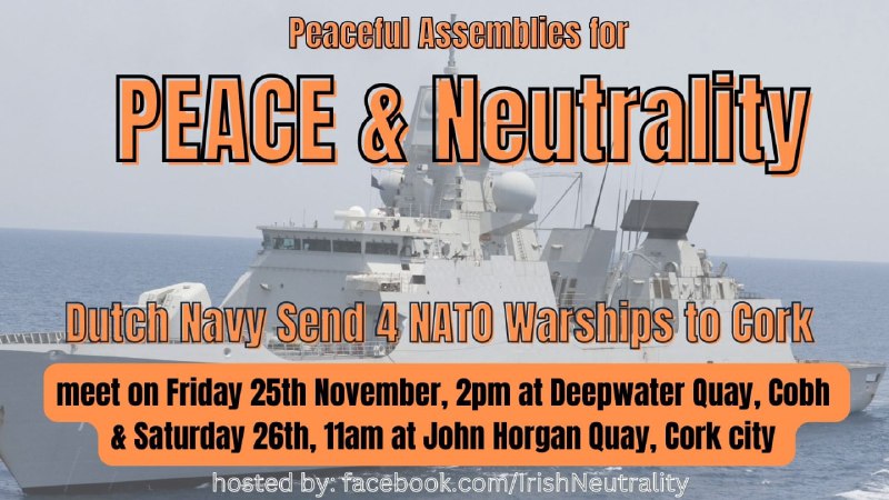 Four Dutch Navy warships are coming to Cork next Friday, these are part of NATO which is an active and aggressive military alliance.