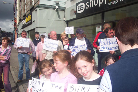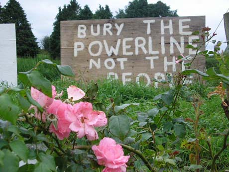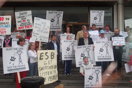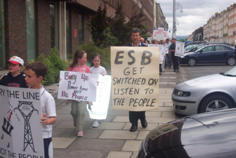 Oct 2001: Planning permission granted by the 3 Co Cos Roscommon, Sligo and Leitrim. Oct 2002: An Bord Plenala upheld Co Councils permission and ignored advise of Mr. Wall their inspector who deemed the EIS to be 70% inaccurate and advised permission should be refused. June 2003: Complaint and Petition sent to Europe based on inadequate Environmental Impact Statement (EIS) and the ESBs failure to comply with many EU Directives like consultation with the locals involved. Nothing positive heard back, EU pointed out that EIS was done and the fact it was 70% inadequate appeared irrelevant. Matter still ongoing. Nov 2003: first wayleaves issued to landowners who were notified of ESBs ‘intention to start work immediately but no later than Jan 04’. March / April 2004: work began in Coillte lands and on farmers lands where permission to enter lands was given. IFA and ESBs reps began visiting landowners to gain either verbal/written consent to access lands. Many older farmers/single people particularly in Sligo section were talked around and gave in. IFA worked out ‘great deal’ for all landowners €11,250 per pylon and €11.50 per metre of line crossing over lands. Oct 2004: we first received notification of thir intention to enter our lands, workers never showed up on date named by ESB after our solicitor pointed out strongly our opposition to plan. Between Oct 2004 – June 2005 we received 5 letters from ESBs lawyer stating their intention to ‘enter our lands as a matter of urgency’ and 3 letters contained High Court Injunction threats which would take place ‘without further notice’ if we made any attempt to stop ESB personnel entering our private lands. 2nd Feb/1st June and 21st June 2005: We were visited by 2 ESB reps. On 21st June we refused access outright and a crowd of 50 –60 gathered outside our home to support our opposition to pylons. 2 ESB reps called to our door on June 21st, 2 ESB jeeps with approx. 8 workers parked about 70m down the rd and a digger was parked about a 1/2 mile away from house. 2 Gardai also waited outside our front gate at invitation of ESB. July 4th : anti- pylon protest outside ESB premises in Sligo town about 50 attended. Much radio and newspaper coverage. July 25th 2005 : National protest with approx. 150 people outside ESB HQ on Lower Fitzwilliam Street in Dublin. INN and Irish Times coverage as well as local stations and newspapers. August 22nd 2005: Local protest outside ESB premises in Carrick on Shannon again much interest by local media.