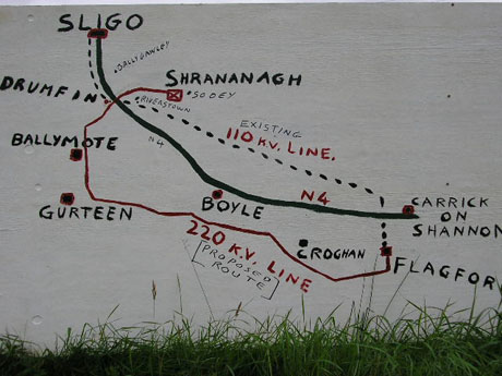 just a few points in reply to comment by blue bear;first re; sligo needs power,this is not true.Sligo uses 47 megawats of power,this can be delivered by one 110Kv line.There are at least three 110Kv lines going into sligo,all running under capacity.Also,the proposed line does not actually go to sligo but to Ballysummanagh which is eight miles from sligo town.The line really goes past sligo and on to Donegal and up to Coolkeera at Derry.So "sligo needs power" is just a story from Dr Spin,ESB.
