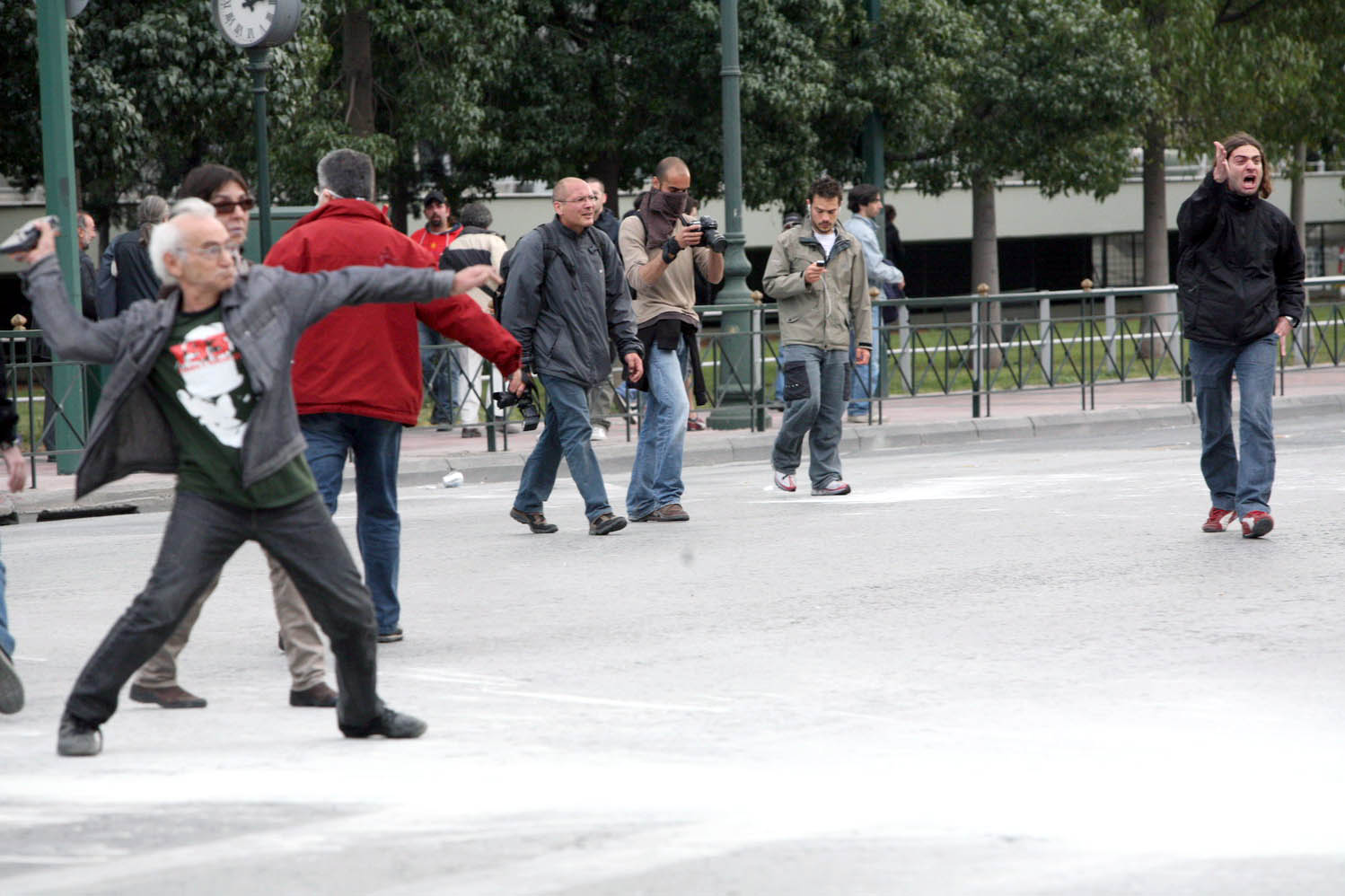 i take my hat off to the auld guy throwing the object (under magnification it looks as if it could be some electronic gear?). he has an interestying choice of t-shirt as well. under magnification it is clearly revealed to be the frankenstein monster. could there be a new dadaist international?