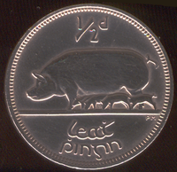 The Free State coinage was completely replaced by a new decimalised half-penny (designed by an Irish artist Gabriel Hayes who adapted an ornamental bird which many thought a peacock from manuscript MS.213 in the Cathedral Library in Cologne, Germany) in 1971. From sow and piglets to mythical Peacock the money in Irish pockets would wait another 31 years for the introduction of the Euro and its cent parts.