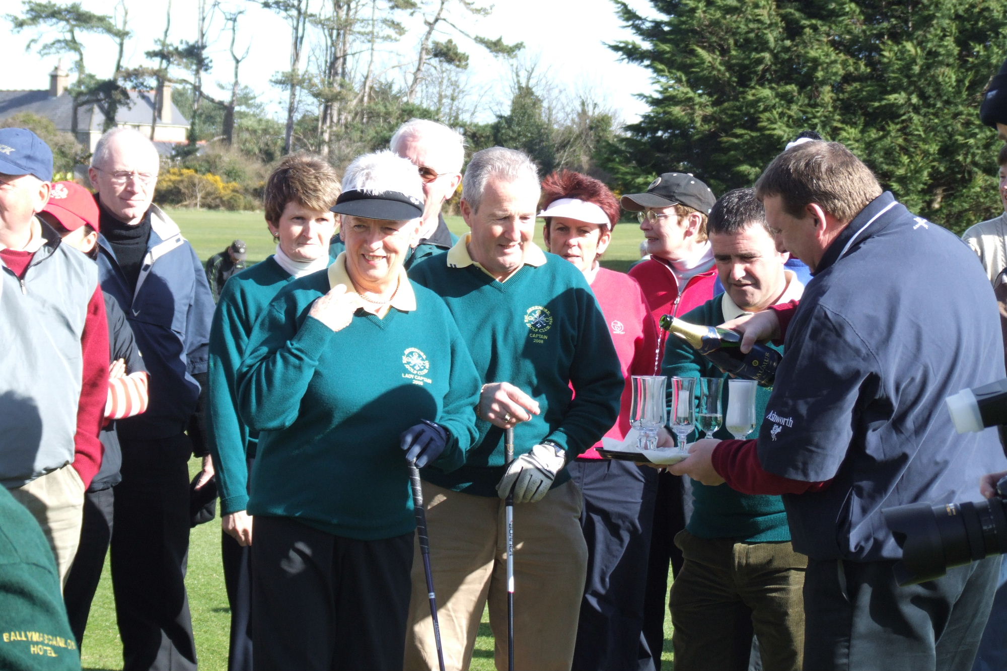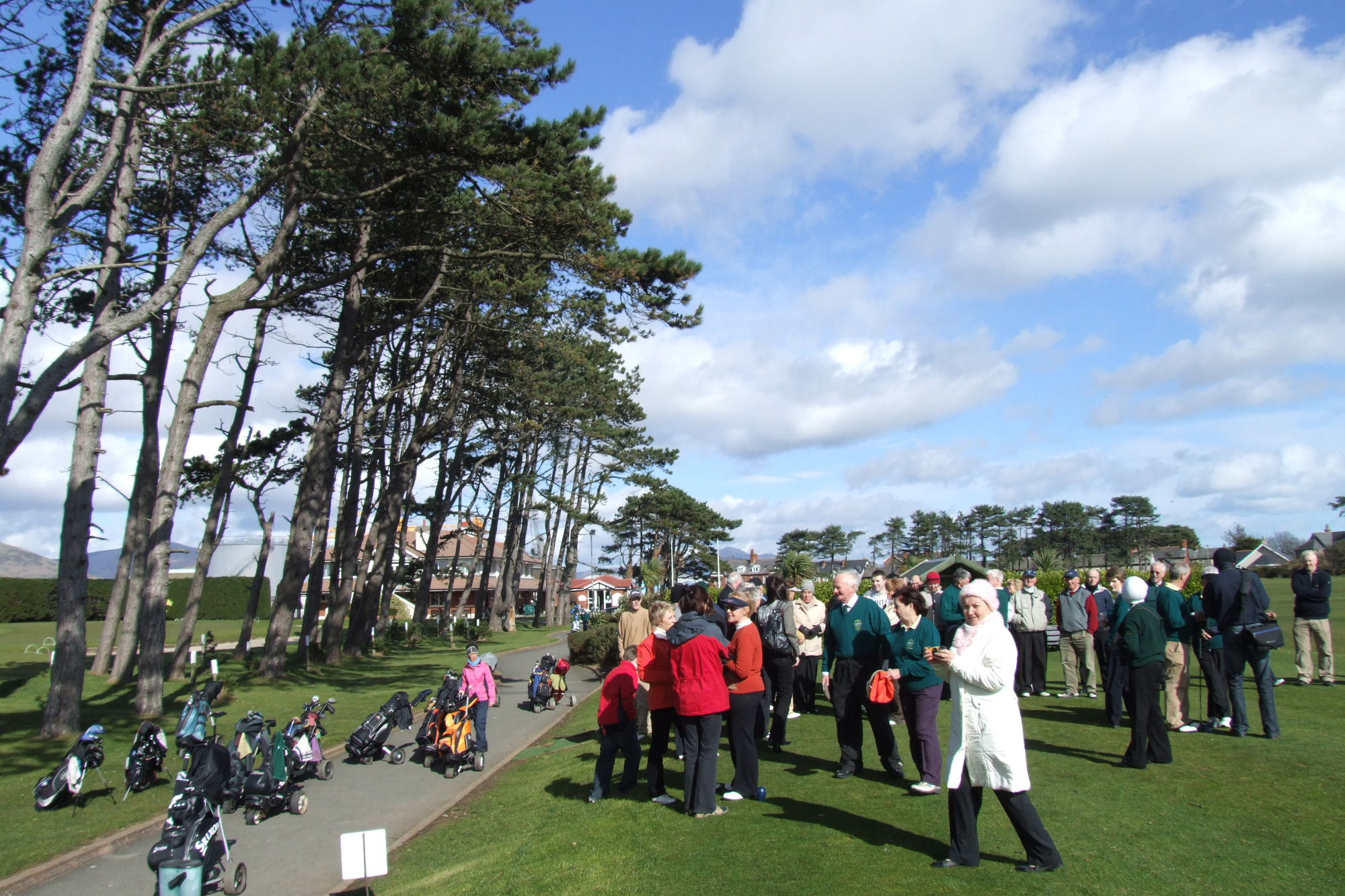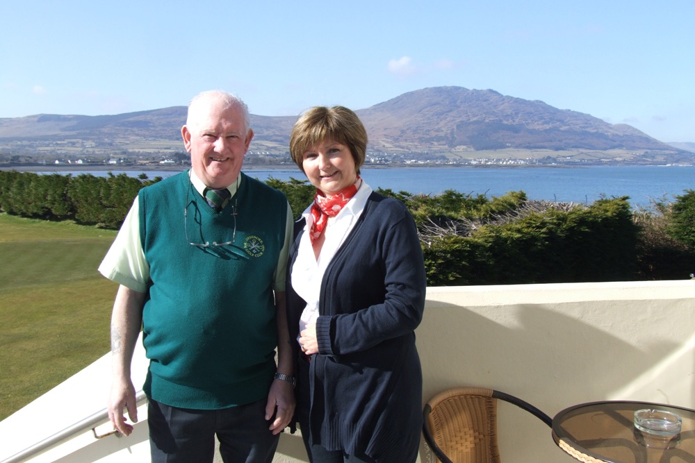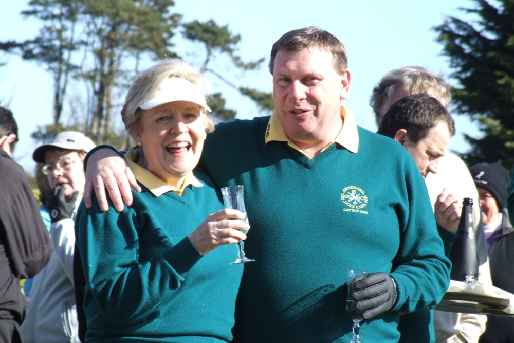 Pat Closkey the lady captain hails from Ravesdale where she still lives on her farm. Pat is a retired national school teacher. Seán O'Hanlon the men's captain resides in Bellurgan. He is a native of Greenore. His business deals with alarms and his wife Pauline is a nurse. A mixed scramble was played today in excellent conditions. There were two shotgun starts, one early in the morning and the other at 13.00. When the drive-in was taking place at 12.45 there was not a cloud in the sky over Greenore. An omen for the golfing year to come?