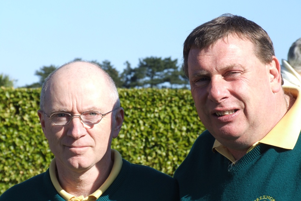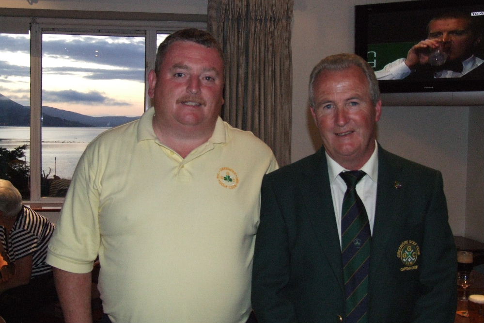 Danny Carr (left), winner of 2008 Captain's Prize in Greenore Golf Club pictured with club captain, Michael Shields, just before the presentation of the prizes on Sunday 31 August 2008. Carlingford Lough may be seen in the window in the background.