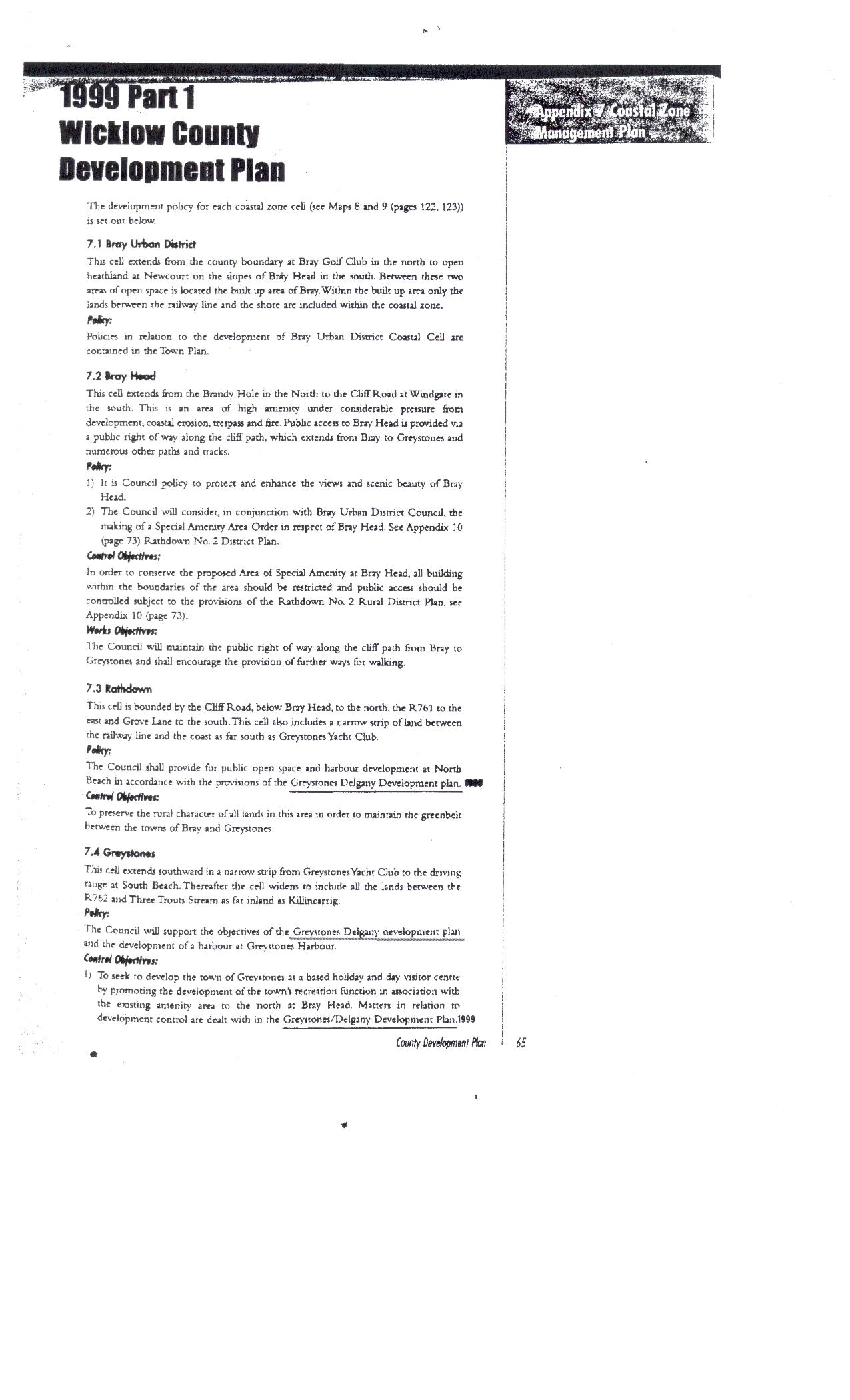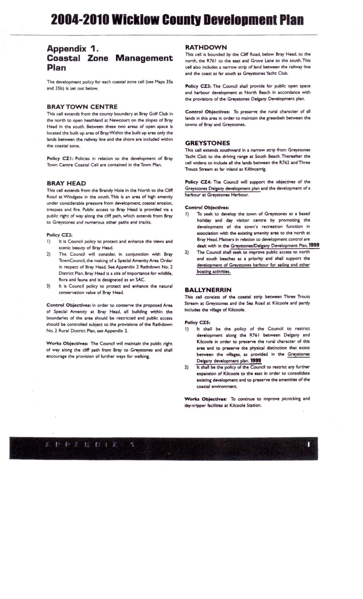 This is the Wicklow County Development plan 2004-2010.This is the document that An Bord Pleanala based their findings on in the granting of planning permission at the North Beach Greystones.As you will see from the evidence in front of you it states nowhere in this document in relation to the construction of 341 residential units on the public foreshore.You will also see the 1999 Greystones/Delgany Development plan underlined in this document.As stated in our previous statements the 1999 development plan was enshrined in the county development plan as far back as 1999,which was the original local area plan for Greystones and Delgany.As stated the findings was based on the county development plan and because of this under no circumstances should there be building on the foreshore,because of the 1999 Greystones/Delgany Development plan which is built into the county development plan and was made into planning legislation in january 2004.All we have stated here in this comment is fact and can not be denied and comes under the planning acts of 2000,and can not be covered up no matter what the Greystones Chamber Of Commerce wants you to believe.You can avail of the county development plan at the public library in Greystones or the Council Offices Of Wicklow.