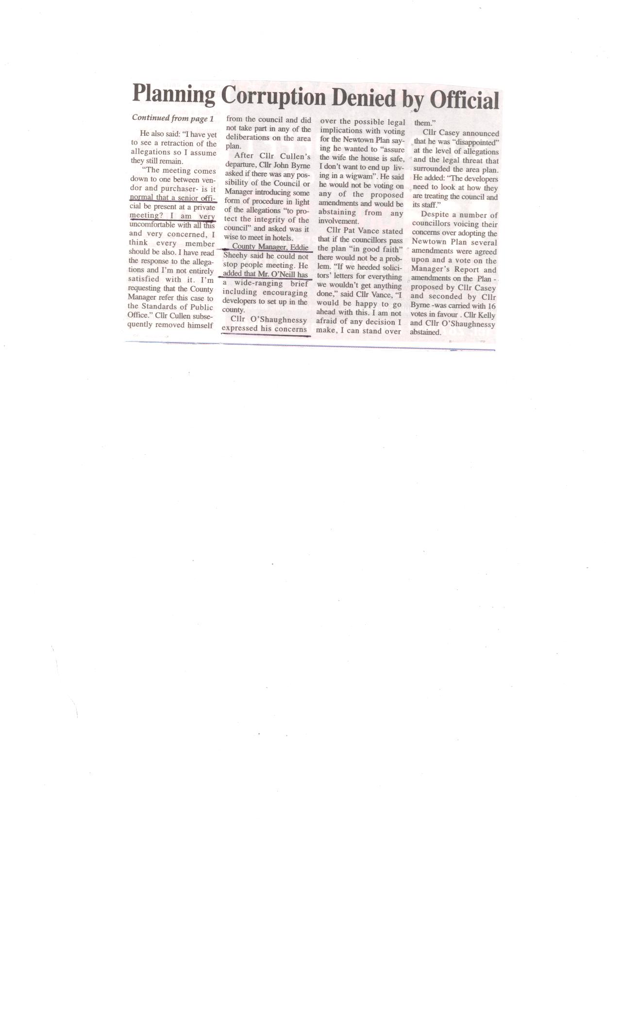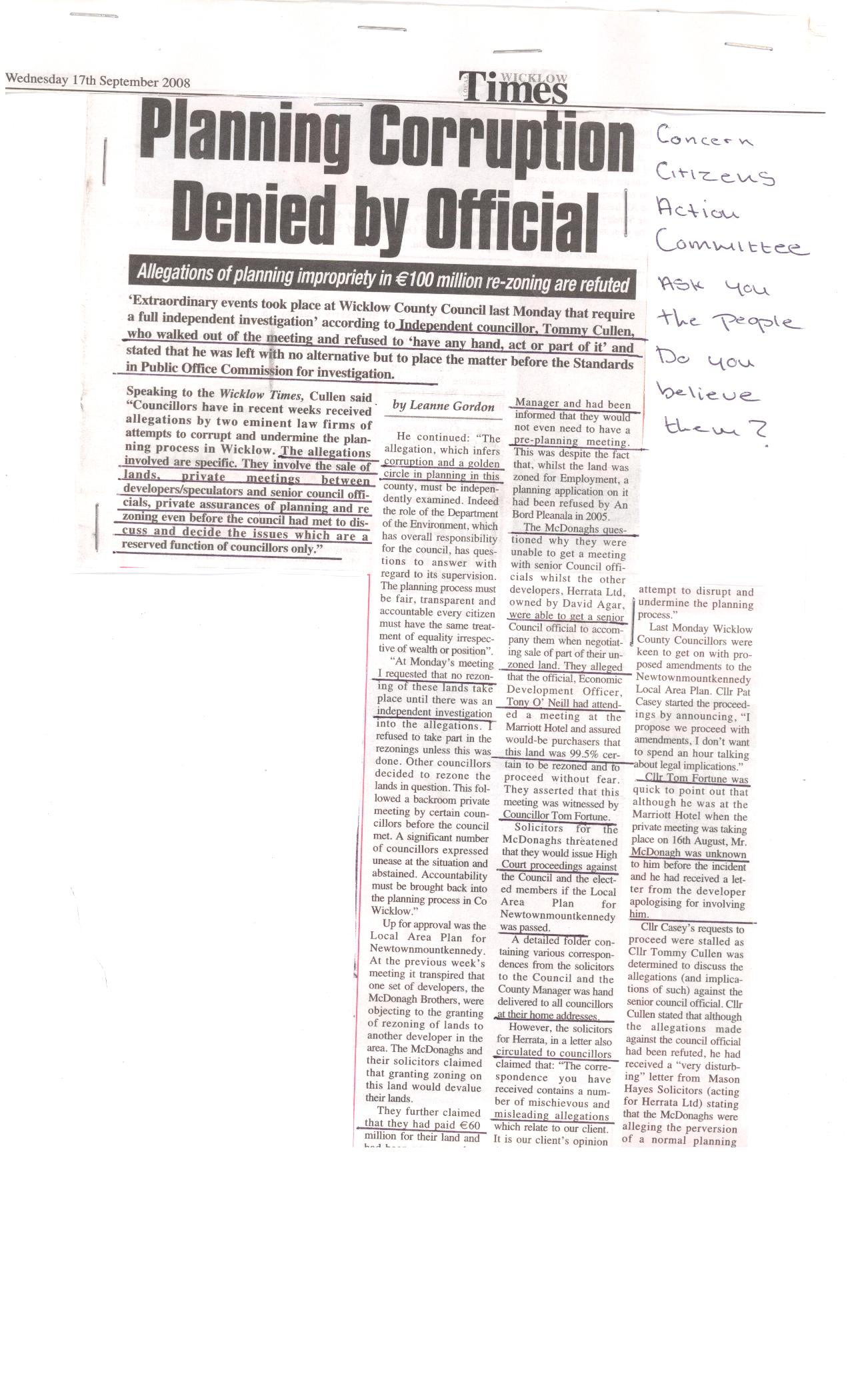 This Story was published in the wicklow times on wednesday the 17th of september 2008.It is to do with two developers in which one of the developers had a fallen out with the county manager and spilt the beans to his solicitor in relation to backroomed meetings that went on behind closed doors.We see in this newspaper article where corruption is exposed because there is no solicitor in this land would put his signature on any letter if the evidence in this newspaper article was untrue.READ THE STORY we leave it up to you to decide.