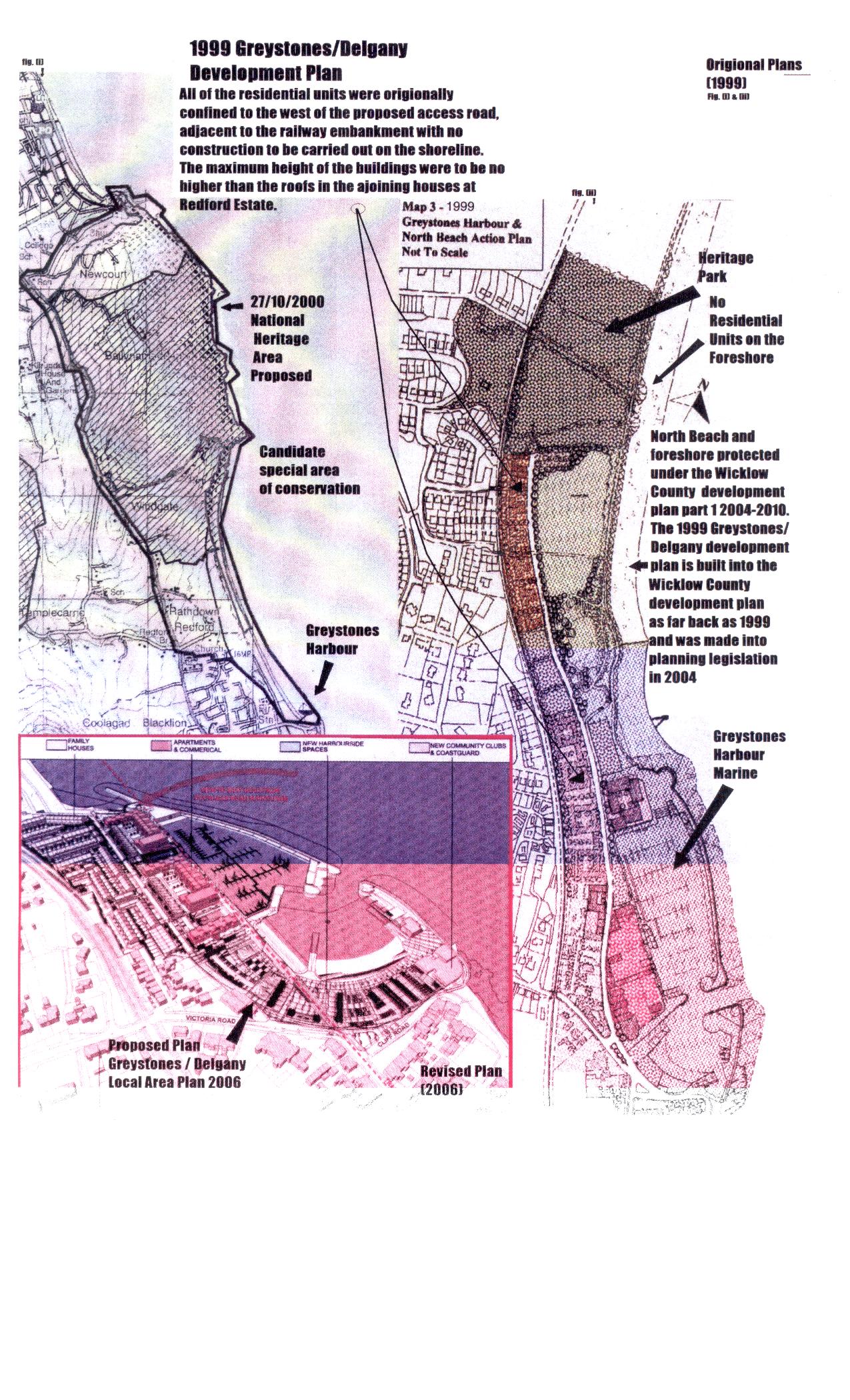 The Above document is the original local area plan for Greystones and Delgany.This is the one that your local councillors removed from the town of Greystones and Delgany,to facillitate the developers who needed to be given the guarantee to build apartments on the public foreshore because as you will see in this document under natural and man-made amenities preserve the beach and foreshore and the provision of a marina but no mention at all regarding apartments.Why is this ???.As stated in this document which is in the county development plan 2004-2010 and was made into planning law in january 2004,this was the original plan for Greystones and still is.The 2006 Greystones/Delgany local area plan is outside the remit of the 2004 county development plan so in other words this plan has no power whatsoever in Greystones and Delgany, which was a rogue plan introduced by your councillors to suit the developers and impose this on the people without asking them for their democratic opinion in all of this.As it stands with this planning permission the apartments are an illegal entity that should not be in that planning permission and we at the Concerned Citizens Action Committee is opposed to this and fully support the 1999 Greystones/Delgany Development plan which protects the public foreshore for the north beach Greystones,and nevermind what the Greystones Chamber of Commerce is saying because they at the end of the day are only interested in their own business interests.They proved this to all of you when they completely ignored 6,000 objections first time around.What does this tell you about them???.it is now time to hit back now.Roll on the 2009 local elections.