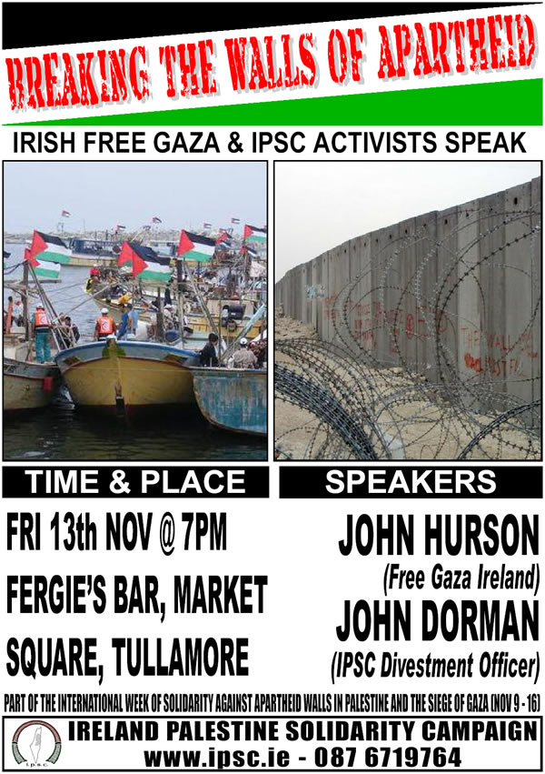 As part of the IPSC's Week of Solidarity Against Apartheid Walls in Palestine and Against the Siege of Gaza, the Tullamore branch of the IPSC are proud to host a public meeting with John Hurson of Free Gaza and John Dorman, IPSC Divestment Officer.