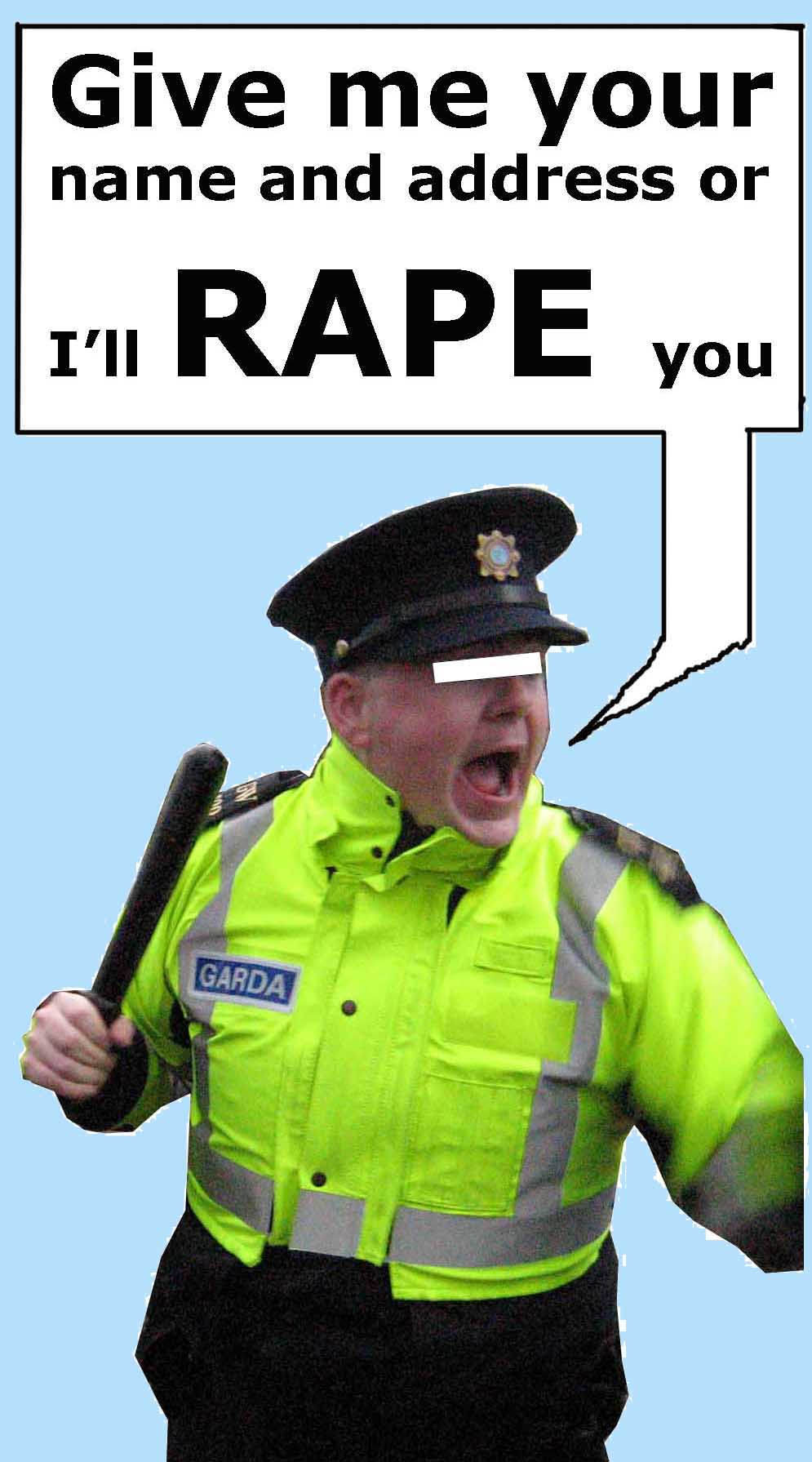 Unidentified Garda: “Hold it there, give me your name and address there, I’ll rape you.”