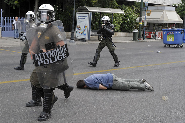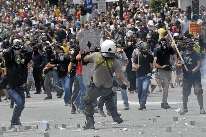 The battle lines of Athens; focusing on the parliament where protesters try to hold up the austerity vote