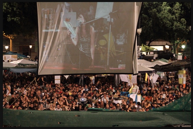 Also last night, the second beautiful moment; When we in the occupied square of Placa Catalunya in Barcelona, #acampadaBCN (campsite Barcelona) connected live with the thousands in the square outside the parliament in Athens via live stream (again how great these new tek tools enable us to connect, even on this massive scale; S2S : square to square). After the massive cheers of greetings from each square of defiance and revolution to the other, we had about 5 or 10 minutes of exchange, giving updates on the situations and hoped for plans for where we go from here.