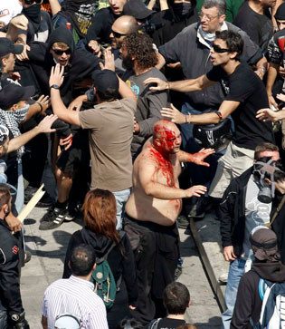 Pictures show trouble already: A man covered in his own blood tries to escape from a group of protesters who attacked him during a protest in Syntagma Square in Athens after accusing him of being a fascist.